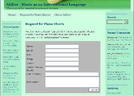 Did you noticed that Ah Doe has just created a Piano Sheet Request to simplify the request procedure?From now on you don’t have to email me or leave comments under my posts and pray that Ah Doe reads your request. Just click the Piano Sheet Request tab, fill in all the details in the form there and click the submit button and your request will be automatically sent to my database!